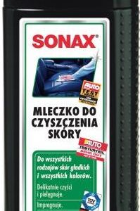 SONAX Mleczko z woskiem do czyszczenia i konserwacji skóry 250mlWysoko gatunkowe mleczko do czyszczenia i pielęgnacji skórzanych elementów we wnętrzu pojazdu, osłon na koła motocyklowe i innych gładkich skór. Odświeża kolory i bez problemu usuwa brud, olej i tłuszcz. Nadaje skórze sprężystość i chroni ja przed pękaniem. Woski pszczele i silikonowe zapewniają skórze długotrwałą ochronę…