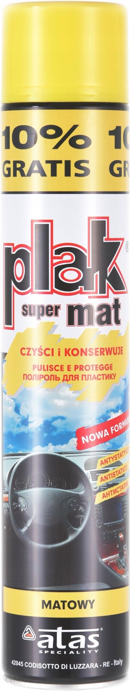 PlakPreparat do czyszczenia i konseracji deski rozdzielczejPlak super mat. Czyści i konserwuje. Dostępny w różnych wersjach zapachowych (zapachy wydawane losowo). Najwyższej jakości środek do czyszczenia i konserwacji deski rozdzielczej. Czyści i odżywia wygląd plastików. Pozostawia matowy efekt, zapobiega refleksom. Antystatyczny – zapobiega osadzaniu się kurzu. Pozostawia przyjemny zapachOpakowanie: metalowa puszka, areozol750 mlWyprodukowano we Włoszech