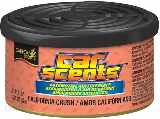 Właściwości:Odświeżacze powietrza California Scents produkowane w słonecznej Kalifornii znane są na całym świecie, a dzięki wykorzystaniu przy produkcji naturalnych składników zbierają najlepsze opinie.W środku puszki znajdują się 3 bloczki z drzewa cedrowego nasączone wonnymi olejkami. Każdy produkt California Scents posiada regulację intensywności dozowania zapachu.Masa wkładu 42 gOpakowanie – aluminiowy pojemnik z wieczkiem z możliwością regulacji intensywności zapachu.Sposób użycia:Należy otworzyć wieczko oraz położyć puszkę np.: pod fotelem lub w uchwycie na kubek i już można cieszyć się świeżym zapachem. Najlepszy efekt uzyskamy w temperaturze powyżej 8 stopni Celsjusza.Zapach: California Crush
