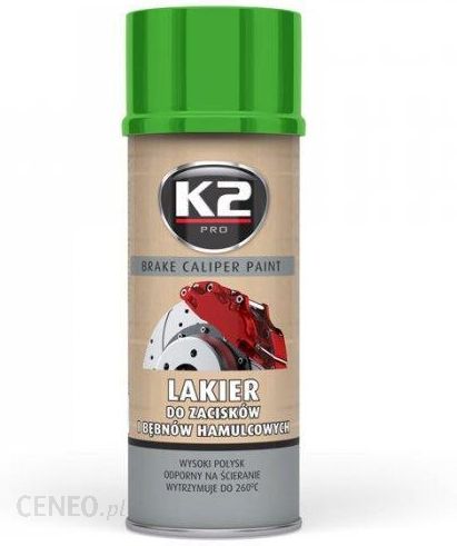 K2 BRAKE CALIPER PAINT to wysokotemperaturowy lakier do malowania zacisków hamulcowych wykonany na bazie najwyższej jakości żywic. Tworzy trwałą powłokę o wysokim połysku, odporną na pył hamulcowy, środki chemiczne, sól, benzynę i niekorzystne warunki atmosferyczne. Działa antykorozyjnie. Nadaje autu sportowy charakter. SPOSÓB UŻYCIA:1. Zaciski można malować bez i po demontażu.2. Przeszlifować powierzchnię papierem gradacji 240-360 w celu usunięcia rdzy oraz uzyskania późniejszej dobrej przyczepności farby.3. Odtłuścić powierzchnię, np. przy pomocy K2 Brake Cleaner.4. W przypadku malowania zacisków bez demontażu, dokładnie zamaskować sąsiadujące elementy.5. Przed użyciem wstrząsać pojemnikiem przez 1 min.6. Nanieść 2-3 warstwy w odstępach 10 min. Nie dopuszczać do zamalowania farbą elementów ciernych, przewodów oraz części ruchomych hamulca. Pojemność: 400 mlKolor: zielony…