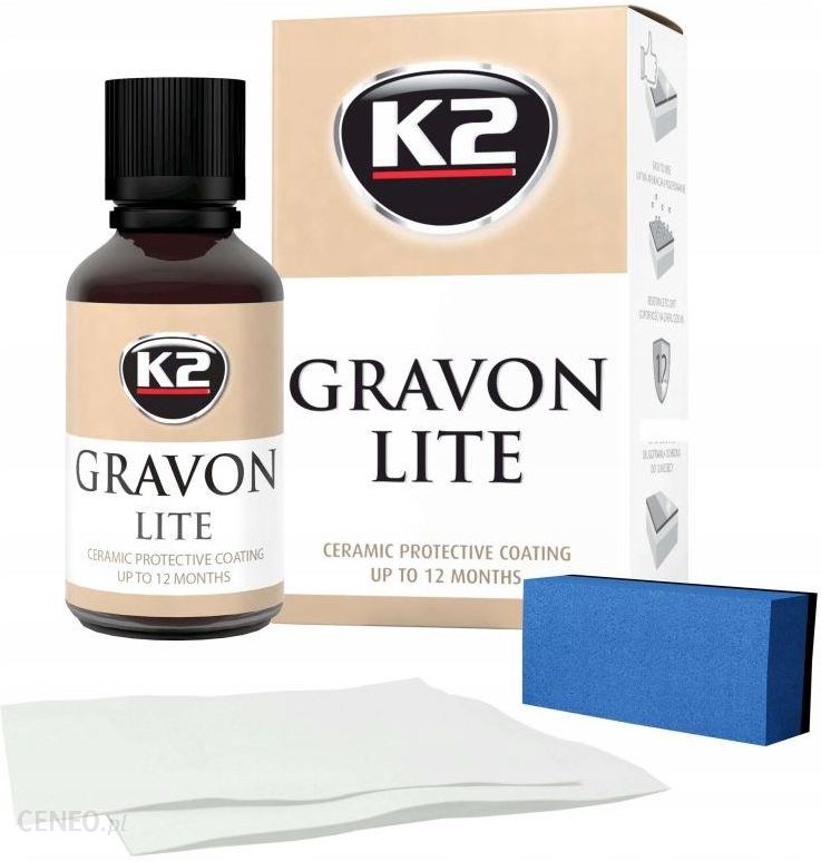 K2 GRAVON LITE – POWŁOKA CERAMICZNA LAKIERU – 50MLK2 Gravon Lite to najprostsza oraz najszybsza w aplikacji powłoka ceramiczna, która zabezpieczy lakier przed zarysowaniami, zabrudzeniami, promieniami UV oraz innymi czynnikami zewnętrznymi. Jedna warstwa powłoki zabezpiecza samochód na 12 miesięcy, jednak można nakładać ją warstwowo, zwiększając ochronę z każdą kolejną warstwą nawet do 24 miesięcy.Powłoka ceramiczna to doskonała alternatywa dla wosków samochodowych, a ze względu na doskonałe właściwości odpychania zabrudzeń można zmniejszyć częstotliwość mycia.W przeciwieństwie do wosków, powłoki ceramicznej nie da się zmyć przy pomocy środków chemicznych, dlatego jest to najtrwalszy znany sposób zabezpieczenia lakieru. Jedyną możliwością usunięcia powłoki jest maszynowe spolerowanie. Powłoka ceramiczna zabezpiecza również przed graffiti, naniesiona farba nie przylega do powierzchni i łatwo daje się usunąć.Produkt K2 Gravon Lite 50 ml wystarczy na naniesienie 3 warstw na lakier + zabezpieczenie felg (w zależności od wielkości samochodu).Zestaw zawiera K2 Gravon Lite 50 ml + aplikator + 2 chusteczki.