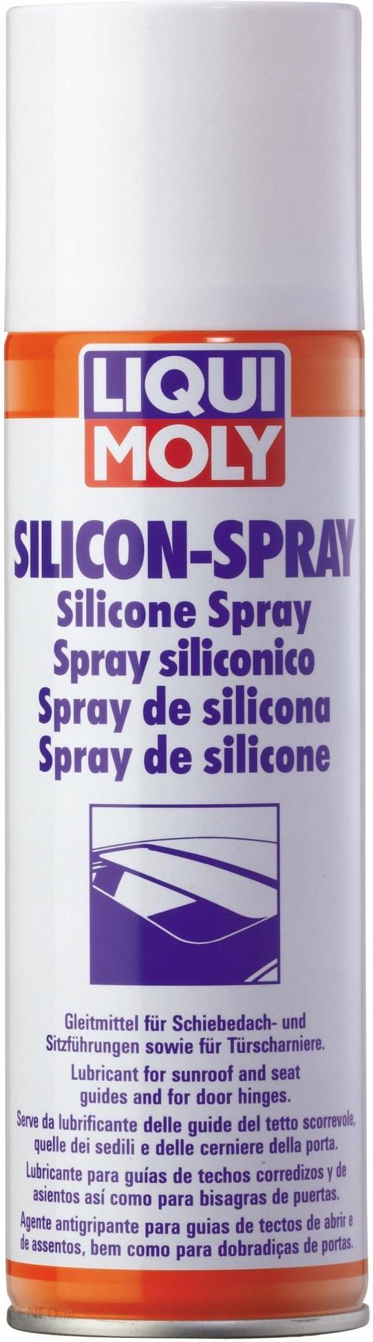 Spray silikonowy do prowadnic szyberdachów, prowadnic foteli, konserwacji motorów, rowerów, maszyn do szycia, łącza hamulca ręcznego, dźwigni bagażnika, zawiasów, uchwytów, łańcuchów, klamek, zamków i kłódek, karniszy itp.Produkowany na bazie ropy naftowej, nie zawiera tłuszczu.Ułatwia czyszczenie elementów zgrzewanych, zapobiega przyklejaniu się folii. Skutecznie konserwuje i smaruje otwarte elementy ruchome. Usuwa piski i zgrzyty. Odporny na wodę. chroni również elementy gumowe zabezpieczając między innymi przed ich zamarzaniem (uszczelki gumowe w okresie zimowym).