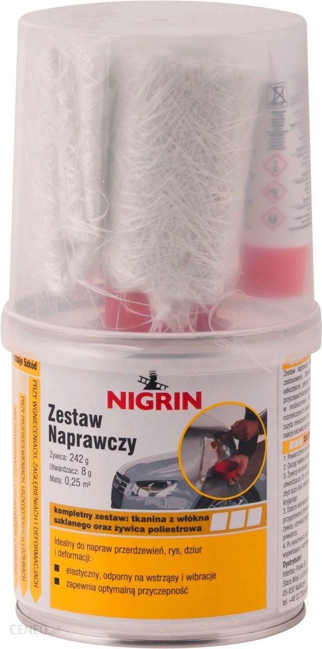 Zestaw naprawczy 250 g firmy Nigrin.Kompletny zestaw naprawczy. Składa się z żywicy poliestrowej, utwardzacza oraz maty z włókna szklanego.Uzyskany z niego laminat posiada bardzo dużą wytrzymałość mechaniczną i elastyczność.Służy do wypełniania znacznych ubytków materiału, spowodowanych uszkodzeniami mechanicznymi czy korozją, a także do wzmacniania i usztywniania powierzchni metalowych oraz wykonanych z tworzyw sztucznych. Idealny do napraw odkształceń, dziur i pęknięć.Po utwardzeniu może być szlifowany i pokrywany dowolnymi szpachlówkami poliestrowymi w celu uzyskania odpowiedniej powierzchni.